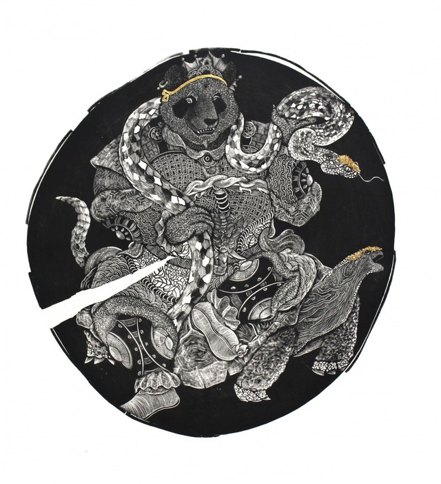 漢 嘯 作品 -------------------------------- 素 材:木口板・版画紙・インク 技 法:木口木版 エディション 30枚 サイズ:380 × 360 mm(本体サイズです。ここに額サイズがプラスされます) -------------------------------- ●作品について…四方護法(シホウゴホウ)シリーズ 四方護法シリーズの作品は青竜、朱雀、白虎、玄武という4点である。 それは方位四神の代表の霊獣と呼ばれる東の青竜、南の朱雀、西の白虎、北の玄武である。 四神の信仰は、古代中国で誕生し日本に伝えられたとされる。日本では奈良県明日香村のキトラ古墳や高松塚古墳の四方の壁にもこの四神の図が描かれている。 この四方護法シリーズは、現代の人に親しみをもってもらうために、パンダと四神と組み合わせて描いた。 パンダは赤ちゃんのように丸々としており、成長しても子供のような動きをしていて可愛らしい。しかし、そんなパンダも怒る時がある。この作品を通じて伝えたいのは、万物には両面性があるということだ。 また、四神は中国の伝統絵画である。描かれた四神像は動物図案の美意識が表れている。これは、現代の審美と共通するものがあると考えている。 四神のような伝統絵画は宗教的概念と実生活の需要との関連が深く、数千年以来、民衆が創造しつづけてきた。日常生活で創作された伝統図案には単純な芸術ではなく、民衆たちの祈りを反映しており、それには人々の理想を表現したものや社会的・歴史的な情報が豊富に含まれている。 そのため、伝承した図案は現代芸術のなかで重要な地位を占めている。しかし、現代絵画ではほとんどの芸術家らが現代美術の表現を追求し、伝統から離れていく。このように、伝統的な美意識が将来にわたって受け継がれるのかどうかは疑問である。 そのため、作り手はただ現代風に描き変えるのではなく、作品の中に伝統の深い意味を込めるよう意識して描く必要があると考える。 ----------------------------------------------------------------- ■額縁は画像と異なる場合があります。 ■額のご希望も承ります(別途料金かかります) お気軽にお問い合わせください。 木口木版… 木を輪切りに切り出した表面が硬質な木口板を版木として使用し、ビュランを用いて彫ることで、精密で繊細な表現ができる木版画。木材は、板目の版木よりも硬質で、目が詰っていて密度のある黄楊(ツゲ)や椿、梨、楓などの硬い木材が用いられますが、どれも生産量が少なく、木の太さのサイズまでしかとれないことから、四角く裁断した木口を接着した寄木の版木も作られています。 寄木をしない場合、通常5~6cmの作品が多く見られますが、漢嘯の作品の中にはそれ以上のものも多く見られ、大変珍しい大型の木口木版です。 ※配送のご依頼を受けてから商品の最終確認後(額装含む)、10日以内に発送いたします。