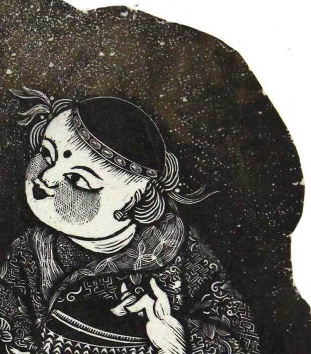 中国の伝奇的な二人の人物「寒山・拾得」を題材とした作品である。 蘇州の寒山寺という寺の名は、唐代の高僧である寒山と拾得がここに来たことから名づけられたと伝えられる。寒山と拾得は伝奇的な人物である。「寒山子」と呼ばれた寒山は、外見は乞食同然 の姿だが、口をついて出る言葉にはみな哲理があり、常に拾得といっしょに詩を詠んだり、偈を吟 じたりしていた。 民間では、寒山、拾得はそれぞれ普賢菩薩、文殊菩薩の化身と見なされている。清の雍正 11 年(1733 年)、清の世宗・雍正帝(ようせいてい)は、寒山と拾得を「和合二仙」として勅命をもっ て封じた。この言葉には「調和と親しみ」「夫婦円満」「家庭円満」などさまざまな意味があります。 中国伝統思想の核心である「和合」には「家に帰る」という意味もある。 調和や円満など、安らぎを覚える題材である。日本で一般的に知られている寒山・拾得ではそれぞれが手に箒と巻物を持っているが、《和合二仙》図では手に蓮の花と盒(蓋のある入れ物)を持っているのがお決まりのようで、愛嬌のある表情の二人が見つめあう姿にほっこりさせられる作品で ある。